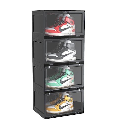 SOGA 4 Tier Black Portable Shoe Organiser Sneaker Footwear Folding Plastic Bin Stackable Storage Box with Magnetic Door