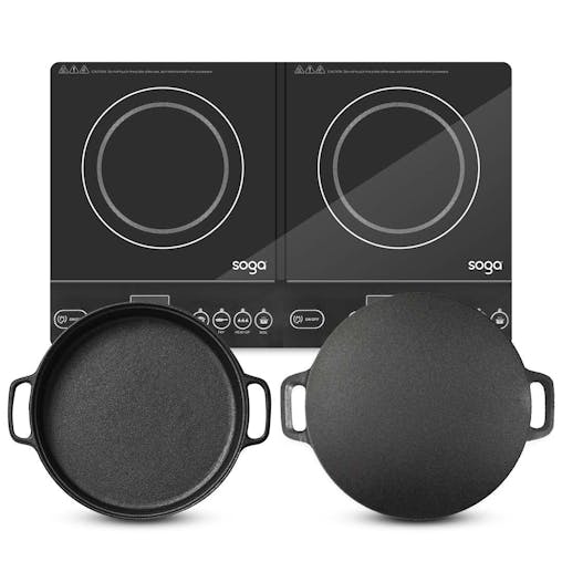 SOGA Dual Burners Cooktop Stove 30cm Cast Iron Skillet and 34cm Induction Crepe Pan Cookware