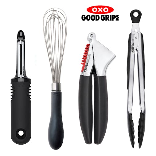 OXO Good Grips 4pc Kitche Essential Set 4 Piece | Peeler Wisk Tongs Garlic Press